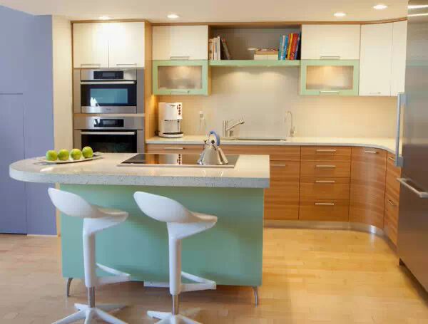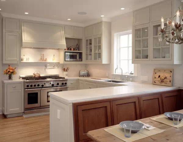 PS:U字形厨房的工作区共有两处转角,因此,对空间的要求较大。当厨房的面积不是很大时,水槽最好放在U字形的底部,并将配膳区和烹饪区分设在两旁,使水槽、冰箱和炊具连成一个正三角形。较大的U字形厨房,则可增加更多的收藏空间,各种家电一般都可以设计进去,甚至可以做双水盆的设计。与L字形厨房一样,U字形厨房的转角位最好不要布置清洗区和烹饪区,因为在这个地方进行主要的操作不太舒适。