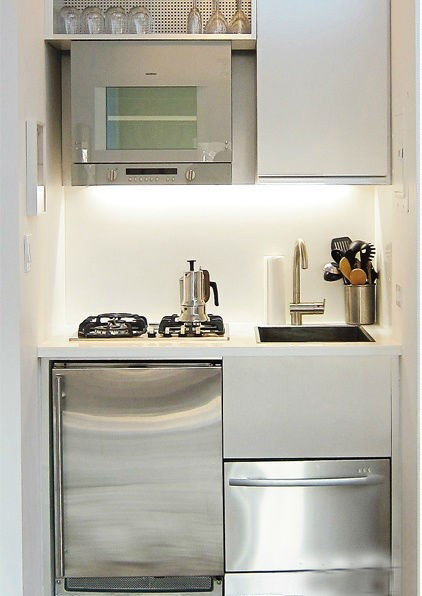 如果是面积较小的单身公寓,时下较流行的是用电磁炉替代燃气灶,在国外,电磁炉的使用非常普及,可以达到环保的效果;厨柜中的油烟机的设计,结合单身贵族的日常饮食习惯,建议油烟机可省略,同时可略去烟井的设置,节省单身公寓的室内空间。