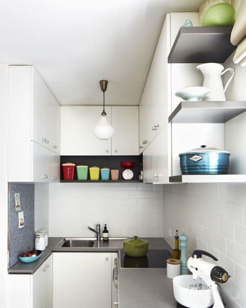在装修和布置小户型厨房的时候不仅需要色彩,还需要亮度,因为小厨房的使用面积非常有限,所以在整体色彩安排方面,应切忌花花绿绿。特别要注意不能使用印有立体感图案或明暗对比强烈的装饰材料,否则不仅会使厨房面积在视觉上显得狭小,而且容易使人产生凹凸不平的错觉。尤其是墙面色彩安排宜以白色或浅色为主,不宜使用反差过大的颜色。