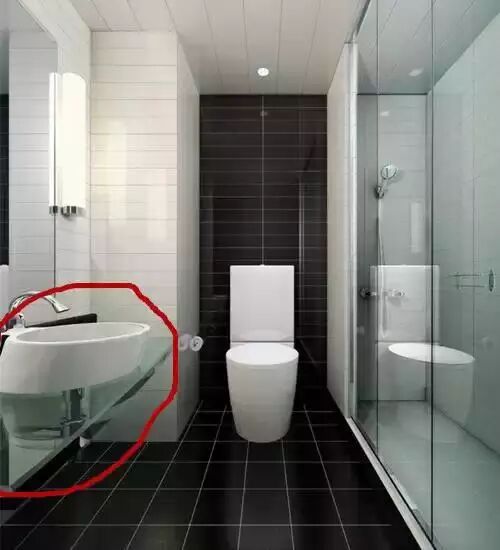 强迫症的朋友卫生间地面避免选择纯粹的白色和黑色,白色和黑色都是最不耐脏的颜色。卫生间毛发比较多,掉在白色地板上清清楚楚,而黑色上的脚印特别明显。另外第二幅图中画红圈的玻璃台面也不太好打理,有什么脏东西甚至清洁之后的抹擦痕迹都清晰可见。