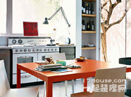鲜艳橘色的餐桌用在略显老旧的厨房中,一下子为这里注入了新鲜活力。聚酯表面的餐桌,非常耐脏、并且容易擦洗。采光极好的厨房中,家里人喜欢在这里多停留,一家人可以在这里吃饭,做功课或者看书。