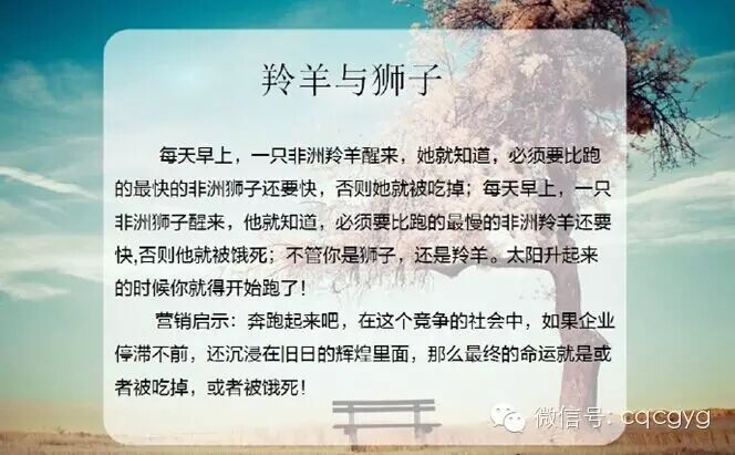从今天开始,让我们奔跑起来吧,在这个充满竞争的社会中,如果我们依然停滞不前,还沉浸在往日的辉煌里面,那么最终的命运就像狮子和羚羊的命运关系,或者被吃掉,或者被饿死!