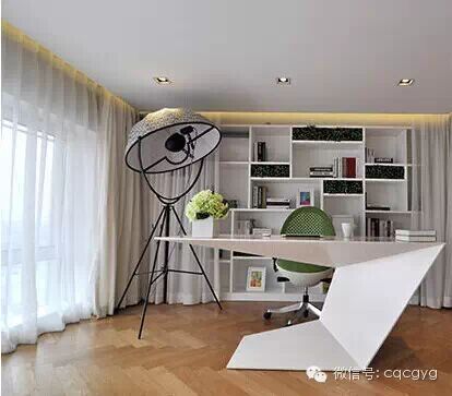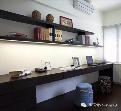 优点:选择房里的某一面墙,贴墙布置,占用空间极其有限,适用于面积较小的室内空间。书架中丰富的层架给家庭办公带来极大便利,仅通过空间的向上延伸就完成了陈列功能的最大化。