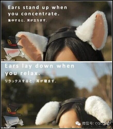 日本电子公司Neurowear研制出一种猫耳造型头箍,可通过传感器对佩戴者的情绪变化作出反应。如果佩戴者情绪沮丧,猫耳便会倒下;注意力集中时,猫耳会竖起;心情愉快时,猫耳会来回摆动;感到疲惫时,猫耳便会像泄了气的皮球一样。卖萌者专用~~