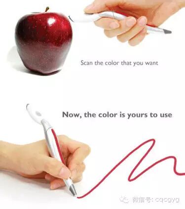 【取色笔】最爱啊!由韩国设计师Park Jinsun设计。无论任何时候你看到了心仪的颜色,只需要将笔头靠近它,然后简单扫描一下,颜色的数据便立即传送到取色笔中,随即,内部的处理芯片便会控制墨盒进行精确调色,这样你就能从笔尖画出同样的颜色了。超想要有木有!