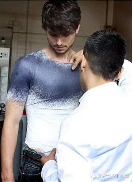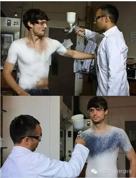 【喷出来的T恤】使用棉纤维制作成的液体,直接喷在人体上,你就可以得到T恤、衬衫、裤子、鞋子等模型了,而且还可以进行水洗。液体喷在身上等待干燥后,只需要像撕面膜一样地从身上揭掉,然后你就得到了一件非常合身,贴身的衣服了。这个好棒!以后衣服都可以自己DIY阿。