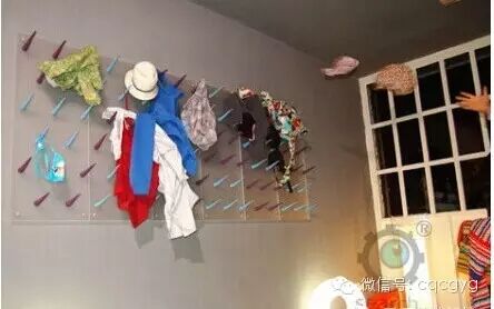 把衣服挂起来的方法有很多,简单的可以是钉一根钉子,常见的是装一个或是一排挂钩,有趣的,可以像这样,是一个个在绳子上攀爬的小人。这些穿在绳子上的小人生动可爱,圆滑的身体可避免给衣物带来损害。