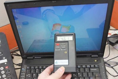 但是,当辐射仪器位于笔记本键盘上方时,辐射值迅速攀升到13.96μt,贴近液晶显示屏辐射值达到14.61μt,辐射值虽然超过了安全标准,但是只要我们在使用笔记本的时候保持20厘米以上的距离,就不会有辐射的危害。