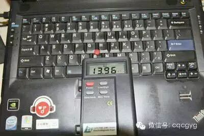 距离笔记本电脑30厘米处,辐射值显示为零,慢慢靠近笔记本,15厘米处辐射值显示依然为零,当贴近笔记本边缘的时候,辐射显示为1.6μt,辐射量符合安全标准。