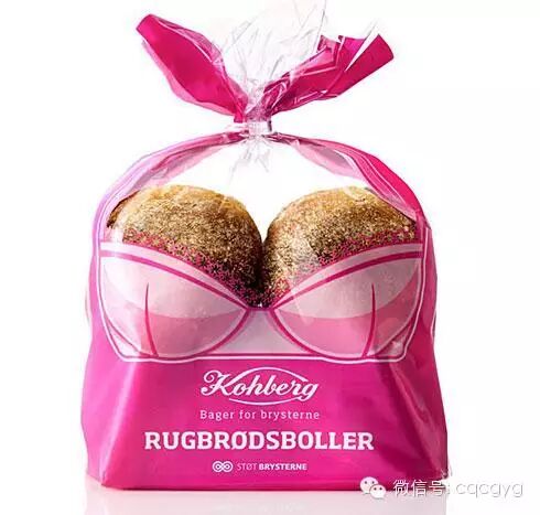 丹麦面包商Kohberg将两个馒头状的黑麦面包装进一只酷似内衣的粉红包装袋中,难道吃了能丰胸?不!Kohberg是要将这种面包的部分收入捐给丹麦的癌症基金会,共同推动乳癌的防治。业界良心!