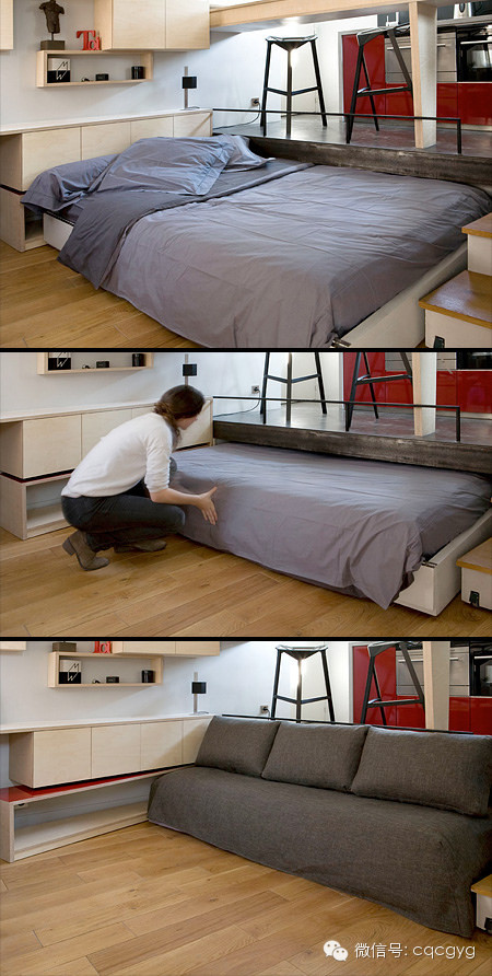将沙发完全拉出,便成为了床铺!原来沙发后方加高的地板空间,是用来收纳床铺,在不使用时之推入收纳,露出可以坐的长度放上靠枕,便成了沙发完全推进去时,更是完全看不出来床铺的藏身之处。