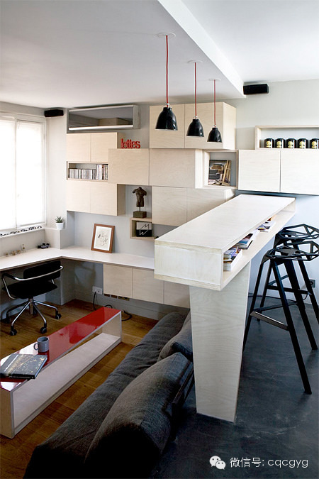由 Julie Nabucet Architectures打造的小公寓,沙发、茶几没有少,并且在墙面以方格做出收纳空间,而沙发更是暗藏玄机。