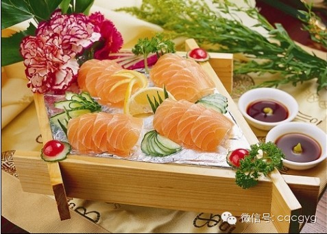 三文鱼拼摆也是一门重要的学问,为表现材料的天然美,用一些木块拼接成不规则形状,在上面铺上冰,把切好的三文鱼放在上面,在旁边的余白处放上一些黄瓜、柠檬等食物。让整个刺身拼盘看起高雅精致且令你食指大动。(配图1)