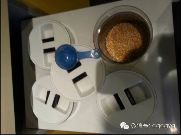 大信将五谷杂粮收纳在最下面的一排储物柜里面,3到5个收纳罐,内置小勺,取放极为便捷。