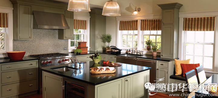 清新田园风格整体橱柜 自然之色装点厨房:该整体橱柜主要采用浅绿色,自然清新,窗户上方彩色条纹的窗帘更是厨房整体风格的点睛之笔。L型橱柜最大化利用了厨房空间,操作起来也非常方便。黑色的台面耐脏质朴,窗户之间的白色墙面巧用同颜色的吊柜遮挡,既不浪费空间,又具备了美观性。