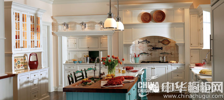 白色田园风格整体橱柜 感受室内自然风情:该款白色整体橱柜将原野般的乡村田园味道引入厨房橱柜中,让家与自然保持持久的对话,享受温暖与安宁。带有鱼虾的壁画,生机勃勃的绿植,以及浅蓝色的中岛台,仿佛使人置身于蔚蓝的海洋。