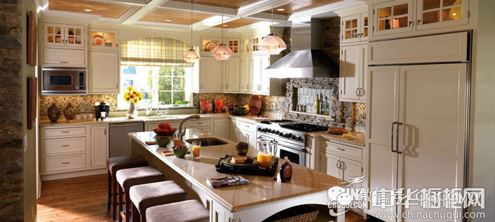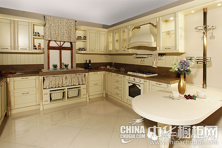 温暖田园风格整体橱柜 阳光照进你的厨房:整个橱柜图片看上去是暖暖的色调,橱柜设计富有个性,吊柜上方玻璃门板的设计显得美观可爱。马赛克墙面、淡雅的窗帘、厨房吊顶都采用格子的元素,整体感很强,风格明显,整体显得多变灵活,带有一丝俏皮感觉。