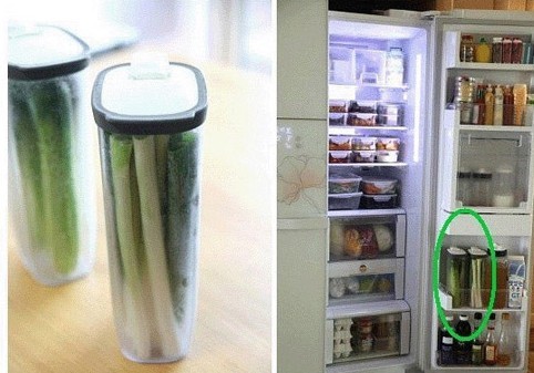大家都知道立起的蔬菜比平放的蔬菜更能持久保持新鲜的吧?然后把容器放在冰箱门的隔层,这样比放在冰箱内侧更容易拿出来的。