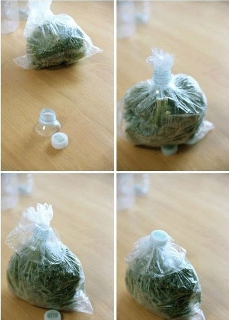如图所示将瓶子的脖子部分切下来,将袋子的口子从瓶口拉出来,拉紧了,再将盖子盖上,就成了所谓的真空包装,呵呵,这个很有效的,可以更长时间保鲜的。