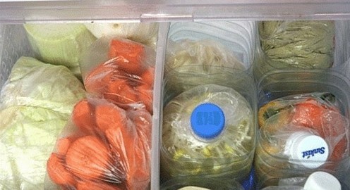 7.四角的饮料瓶可以拿来放蔬菜,这样好分类,而且拿起也比较方便。以前没这么做的时候拿菜经常撕破塑料袋,很不方便。