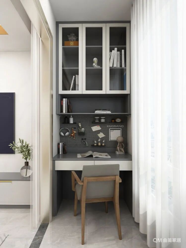 惯常作为功能区域的阳台在这个案例中被开发到了极致——左侧定制书架、书桌,灰白相间的整体设计给人安静沉稳的阅读和办公环境,可以分门别类的安放各类书籍外,墙上同色的洞洞板既悬挂各类杂物,也是很好的装饰品。阳台右侧则放置了烘洗设备,功能齐备、便捷灵活。