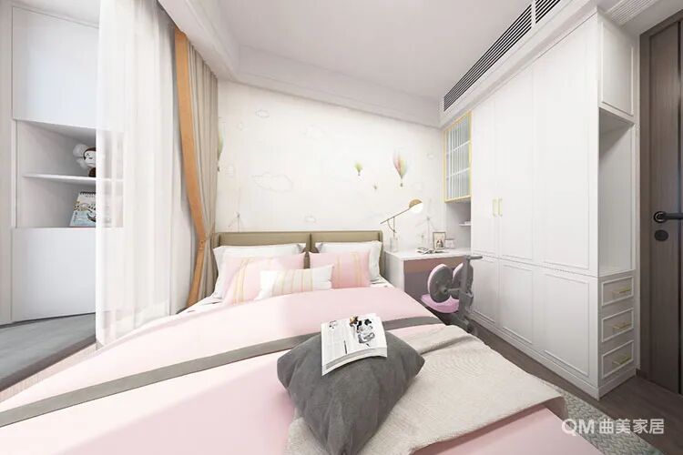 粉色的床上用品、粉色的儿童座椅,这是一个女孩子的房间,处处透着温馨可爱。靠墙定制衣柜与书桌一体设计,既节约了空间,也营造了统一的视感。同样的飘窗设计,切在窗户两侧定制了柜体,开放格中放置一些女孩儿喜欢的毛绒玩具,更增添一些柔和温婉的感觉。