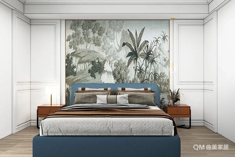 基于女主人对中式风格的推崇,可以明显看出主卧的设计语言中多了一些中式表达,床头墙大面积的水墨画便是明证,两侧的石膏线条对称明确,线条立体,让卧室多了层次表达。蓝色的皮床搭配棕色床头柜,简简单单地营造出一种舒缓的睡眠氛围。