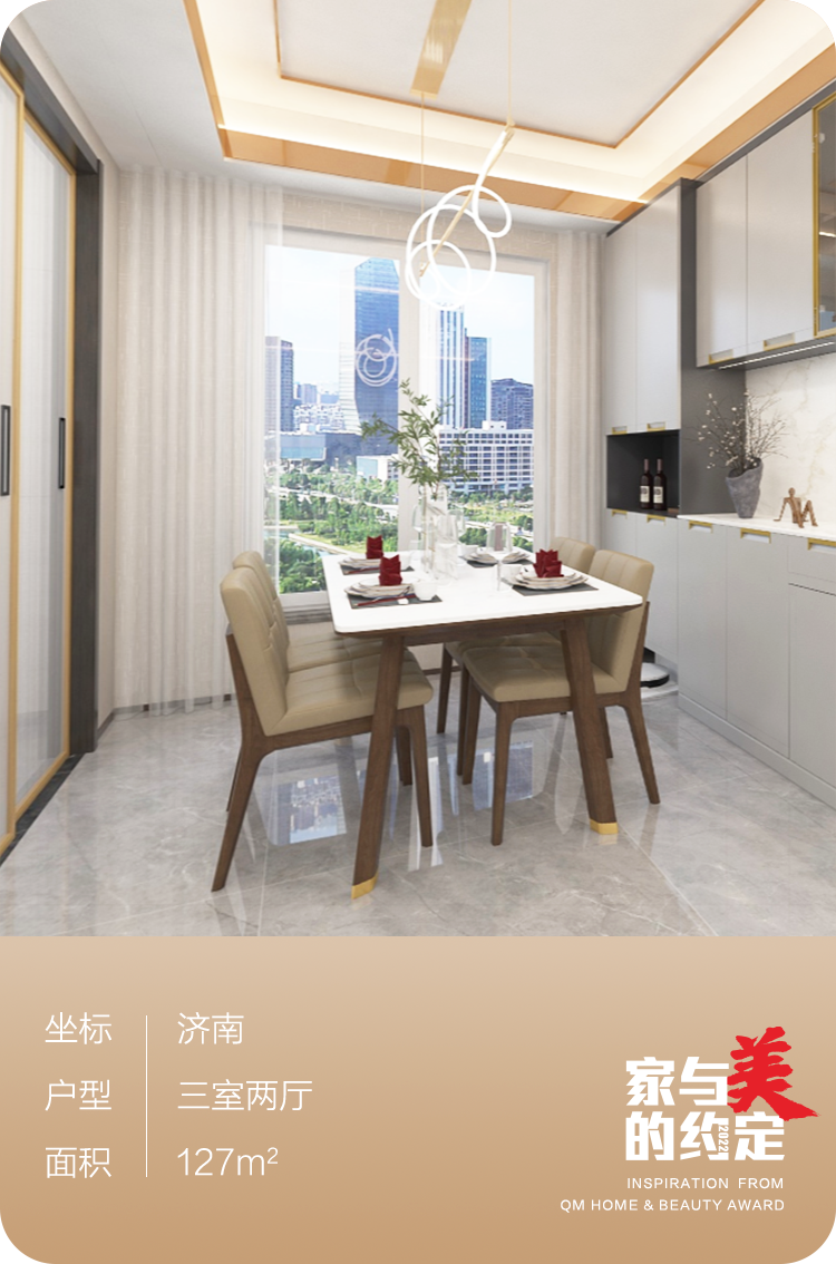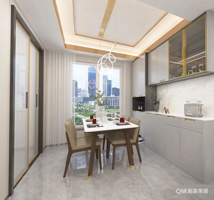 温馨是餐厅给人的初印象。简简单单的白色岩板餐桌搭配咖灰色的真皮餐椅,同时以统一的咖色支腿让产品既统一又独立。靠墙是青灰色的餐边柜,是餐厨空间最为重要的收纳场所,顶柜一侧用玻璃柜门+灯带,放置藏酒最为合适,中间开放层放置简单的厨房小电器,地柜则是各种锅碗瓢盆的“家”。