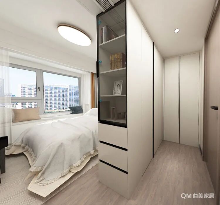 回归主线设计风格的次卧用衣柜隔离出两个空间——卧室和衣帽间,营造出一个轻松舒适的简约睡眠空间。卧室有飘窗,两侧下方掏空做储物,放置一些书籍就是一个单独的读书空间;衣柜用黑色的通顶拉手增加产品质感,边柜上方则增添了玻璃柜门,也是放置书籍或其他摆件的好地方。