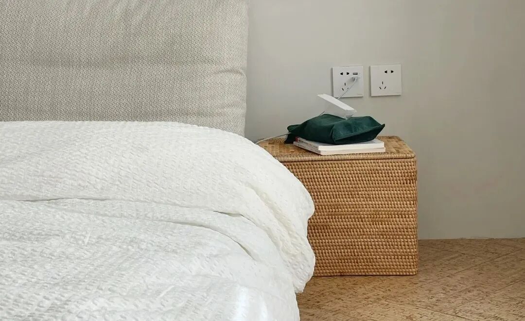 床头柜一般用来置物和收纳,选购时多关注材料的环保性,如果选床的时候有带床头柜的套餐价格就最好不过了。如果想再省一点,还可以选择藤编筐、小推车、边几等作为平替。
