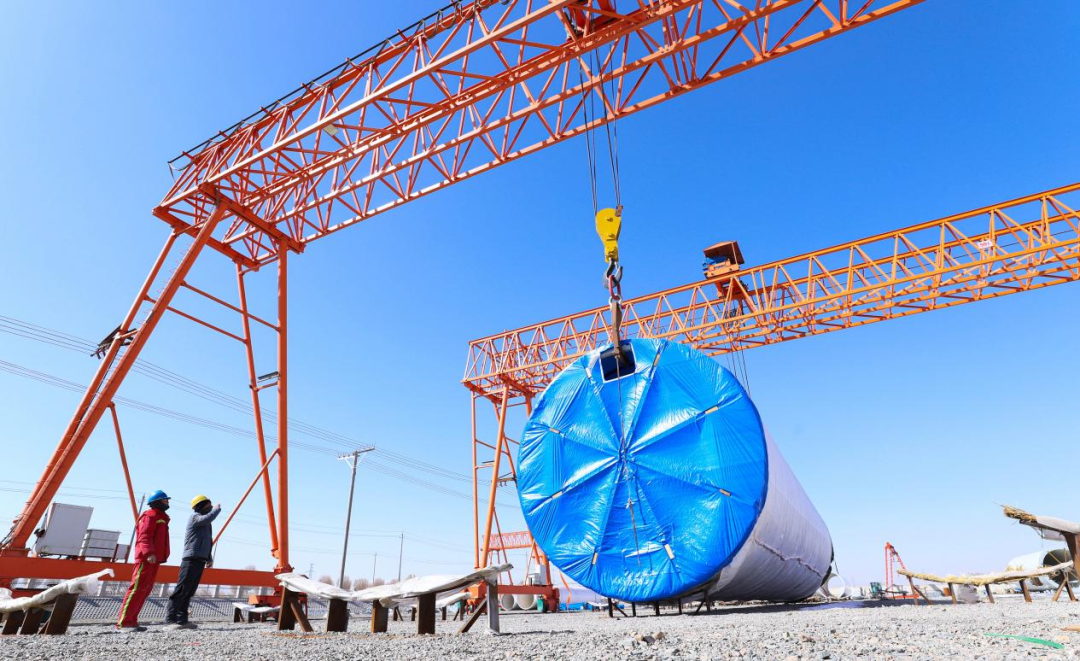 △ 2024年3月7日,甘肃省张掖市,工人们正在吊装风力发电机组塔筒,准备运往安装现场。