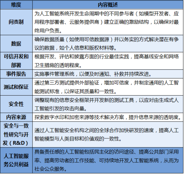 2024年1月16日至2024年3月15日,新加坡通信媒体发展局(IMDA)就生成式人工智能治理框架草案(以下简称“框架草案”)进行公众咨询。该框架草案是IMDA与其全资子公司人工智能验证基金会(AI verify Foundation)合作开发的成果,从以下九个维度对人工智能的治理进行概述: