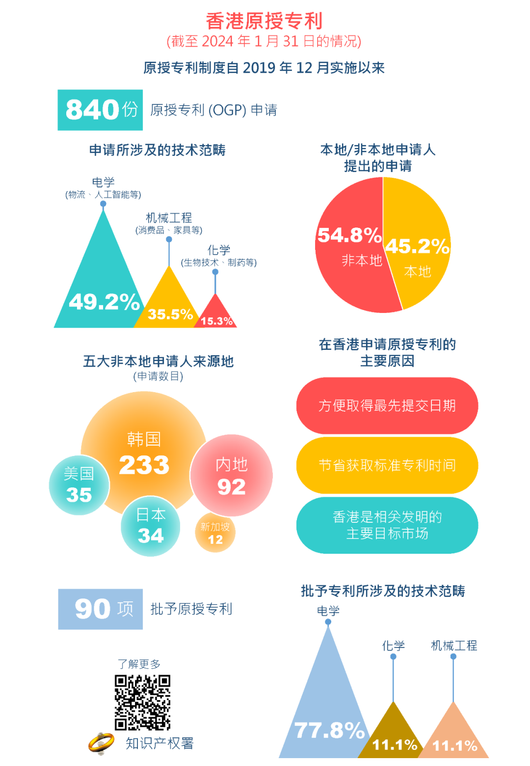 原授专利制度实施刚满四周年。截至2024年1月31日,知识产权署辖下专利注册处共收到840份涉及不同科技领域的原授标准专利申请,并已批予90项原授标准专利。当中,四成多的原授标准专利申请来自香港特区申请人,五成半来自其他地区的申请人,其中申请人来源地主要包括韩国、中国内地、日本、美国及新加坡。