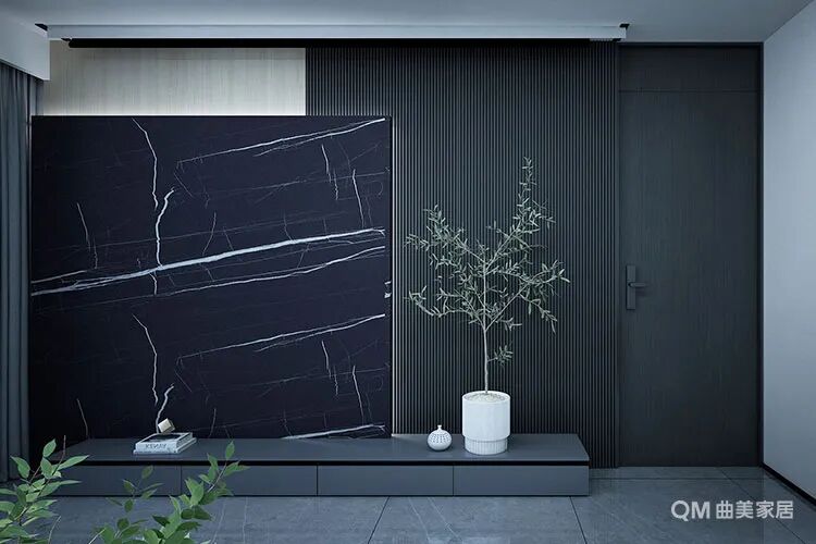 电视墙以大理石和格栅交互穿插,搭配绿植营造简洁清晰的层次感,交错的色差、简单的设计手笔,让材质的质感得以最大程度的展现。