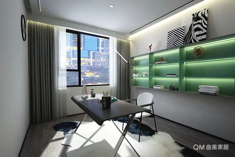 书房的设计相对简单一些,墙上一个绿色的开放式书架,在灯带的作用下,显得极有格调。一张弯曲木书桌简洁异常,非常具有艺术感,地毯是不规则图形,黑白相间、极具张力。