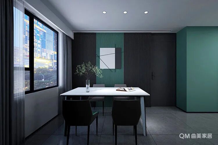 深灰色格栅墙板与靓丽的绿色相互融合,既突出了绿意盎然的生机,也让餐厅瞬间生动了很多。白色的岩板桌面与浅灰色的餐椅配搭,依然通过色彩的差异性去衬托一种艺术情境。白色、灰色、绿色,简单的色彩搭配,就是简单的生活体现。