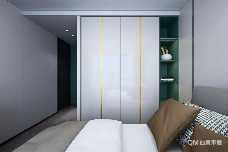 清清爽爽的配色,简简单单的陈设,轻轻松松的格调,让主卧在基本的收纳功能之外能承载更多的睡眠功能。白绿相间的整体搭配,是延续整家的色彩配置,而衣柜通拉门把手的金色点缀,又让空间表达更加丰富流畅。衣柜一侧靠墙是通体绿色渲染的开放柜,放置一些工艺摆件或者书籍都可。