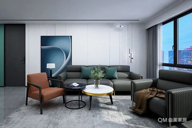 深灰色的真皮沙发让客厅充盈着沉稳、厚重的气质,而莫兰迪橙色的加入,则让空间多了一抹随心所欲的跳跃姿态,柔和了空间、也丰富了空间。背景墙不规则的条纹路线、简洁异常的现代画作,让现代感和奢华感都有了落脚之地和不同的表现形式。
