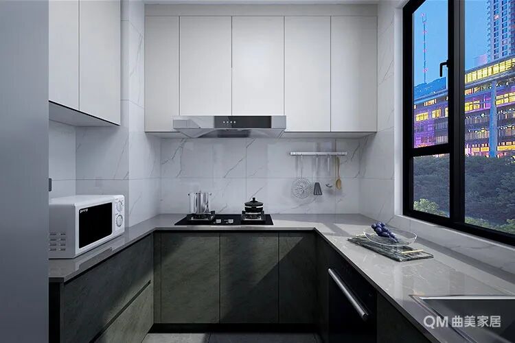白色顶柜和浅色墨绿的地柜是餐厅色彩的延续,浅灰色的岩板案面让整个空间明亮、自然。整体U型的设计格局,给了女主人辗转腾挪的足够空间,在明亮的窗户下,一日三餐也变得更有生机。