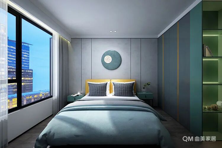 相较主卧的明丽简洁,次卧在配色方面相对更加大胆,颇有后现代主义的神韵——抛弃了简朴,刻意制造出一些情绪,背离整体空间的色彩表达方式,这样的装饰风格对人的精神冲击是全方位的。藉由绿色、灰色、深蓝色、亮黄色的丰富色彩语言,让居者有了一些梦幻般的感触。这样的空间,对于喜爱幻想、偏爱不同的居者来说,很不错。