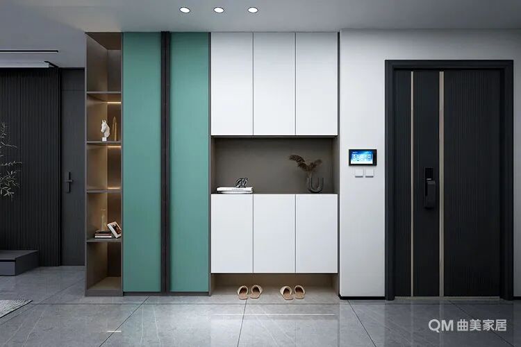 入户玄关简洁明了,以白色玄关柜搭配绿色衣柜满足了出入户最基本的功能需求,同时也奠定了整家的色彩风格。