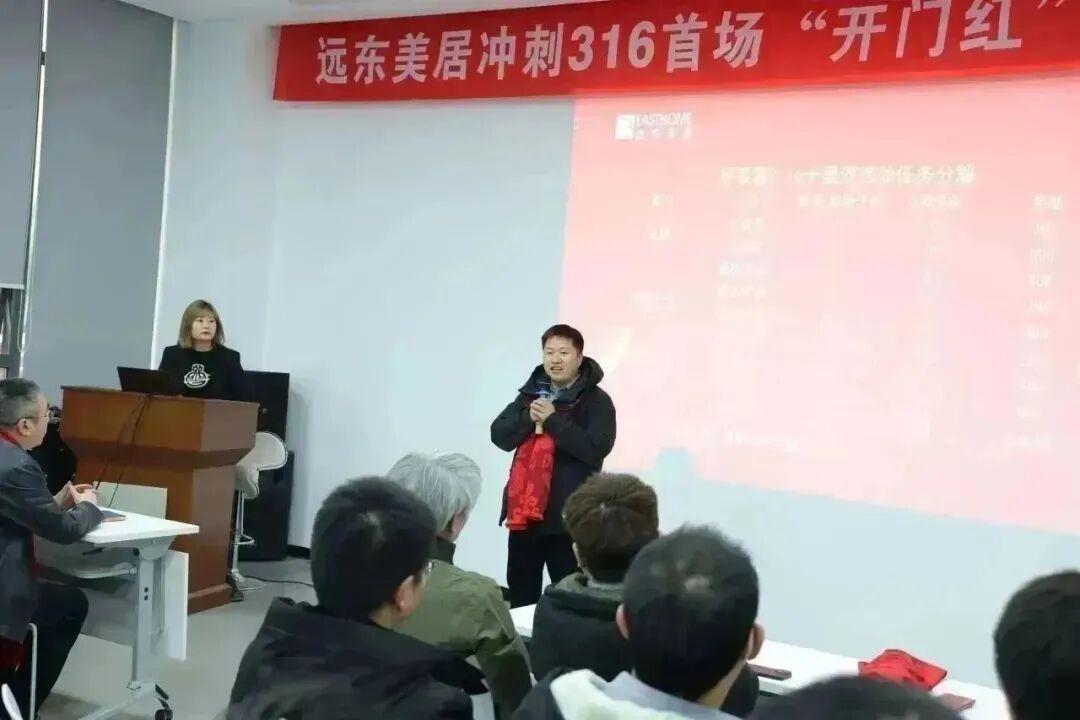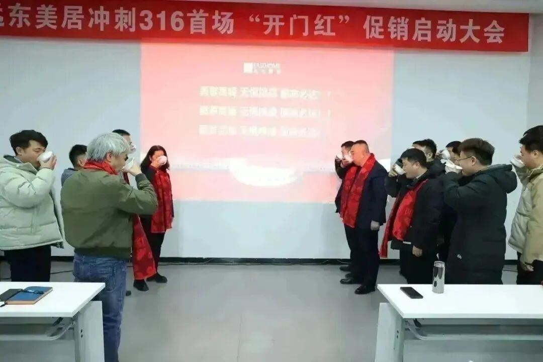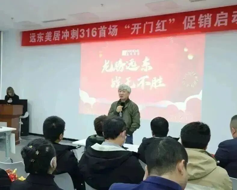 面临复杂的市场前景,消费需求的不断提升,远东美居各品牌总经理依次上台对本次活动打法玩法战略布局做充分详解,提前布局,抢占先机,推动“开门红"活动,同谋划、同部署、同推进,提升全员凝聚力和战斗力。 为将本次开门红的优惠政策、服务落到实处,让每一位家人肩负使命感,各品牌负责人有序上台领壮行酒,喝完壮行酒,便不怕刀山火海,以酒壮胆,誓夺霸主!豪饮一碗壮行酒!必当全力以赴!为自己,为团队,全力出征,无惧挑战、使命必达! 远东神华集团副总裁孙凯孙总深入终端,为出席会议的全体员工分析了 2024年家居建材行业的市场形势和竞争态势,强调各品牌总经理及员工要紧跟公司战略调整步伐,重视公司营销活动尤其是首场 316 开门红促销,要善于利用品牌核心优势单品,做好营销打法升级及服务能力配称。鼓励全员积极转变思维,快速动起来拥抱变化,“想全是问题 干全是答案",各品牌总经理及员工以务实的态度和超强执行力,跟随公司实现开年抢跑,弯道超车。 2024开年首战已然打响,远东人也将继续凝心聚力、全力以赴,誓夺2024开门红全面胜利,为新的一年开好局、起好步,势必抢赢“316 开门红"战役!