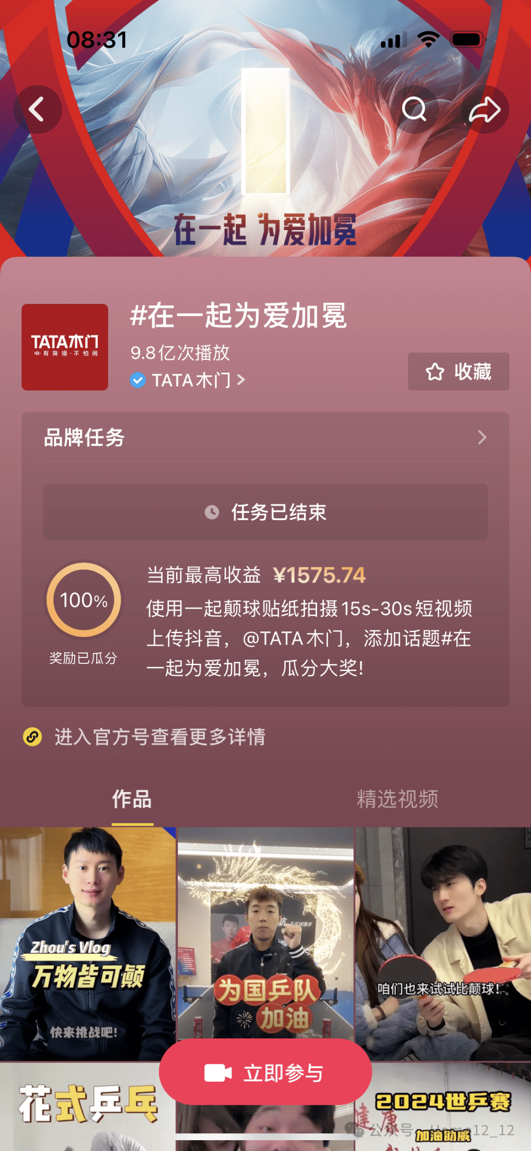 本次世乒赛期间,自2月1日起,TATA木门联合抖音平台发起“花式乒乓球挑战赛”,行业协会、家居媒体、权威媒体、网红达人以及大量抖音用户纷纷参与其中。截止发稿时间,抖音挑战赛全网累计发布视频总量破53000,话题观看量超9.8亿,强势卷起运动热潮、助燃龙年春节假期。