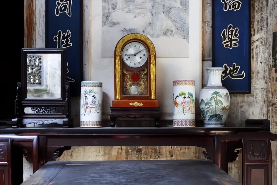 陈设方面,传统中堂条案讲究正中摆放钟表,东侧放置花瓶,西侧放置镜子。
