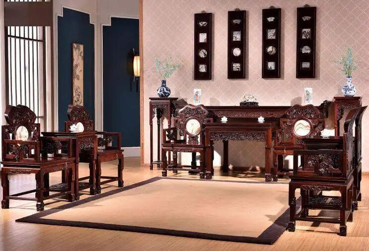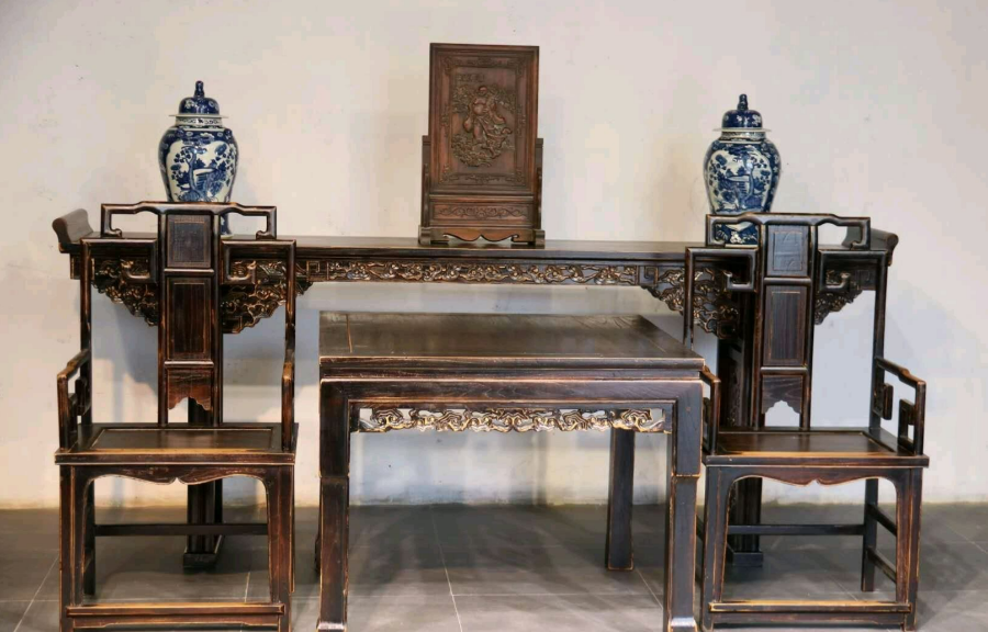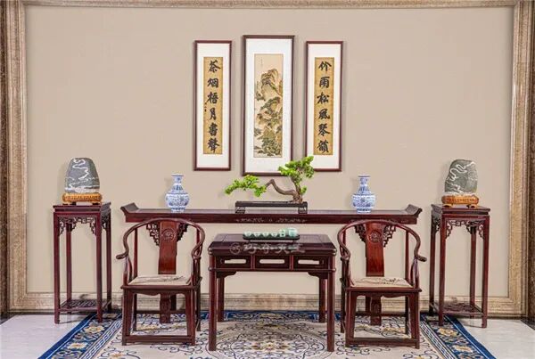 一般由长条案、八仙桌、两把座椅(太师椅或圈椅)组成,讲究的人家会再加一组花几(花架),组成“六件套”。