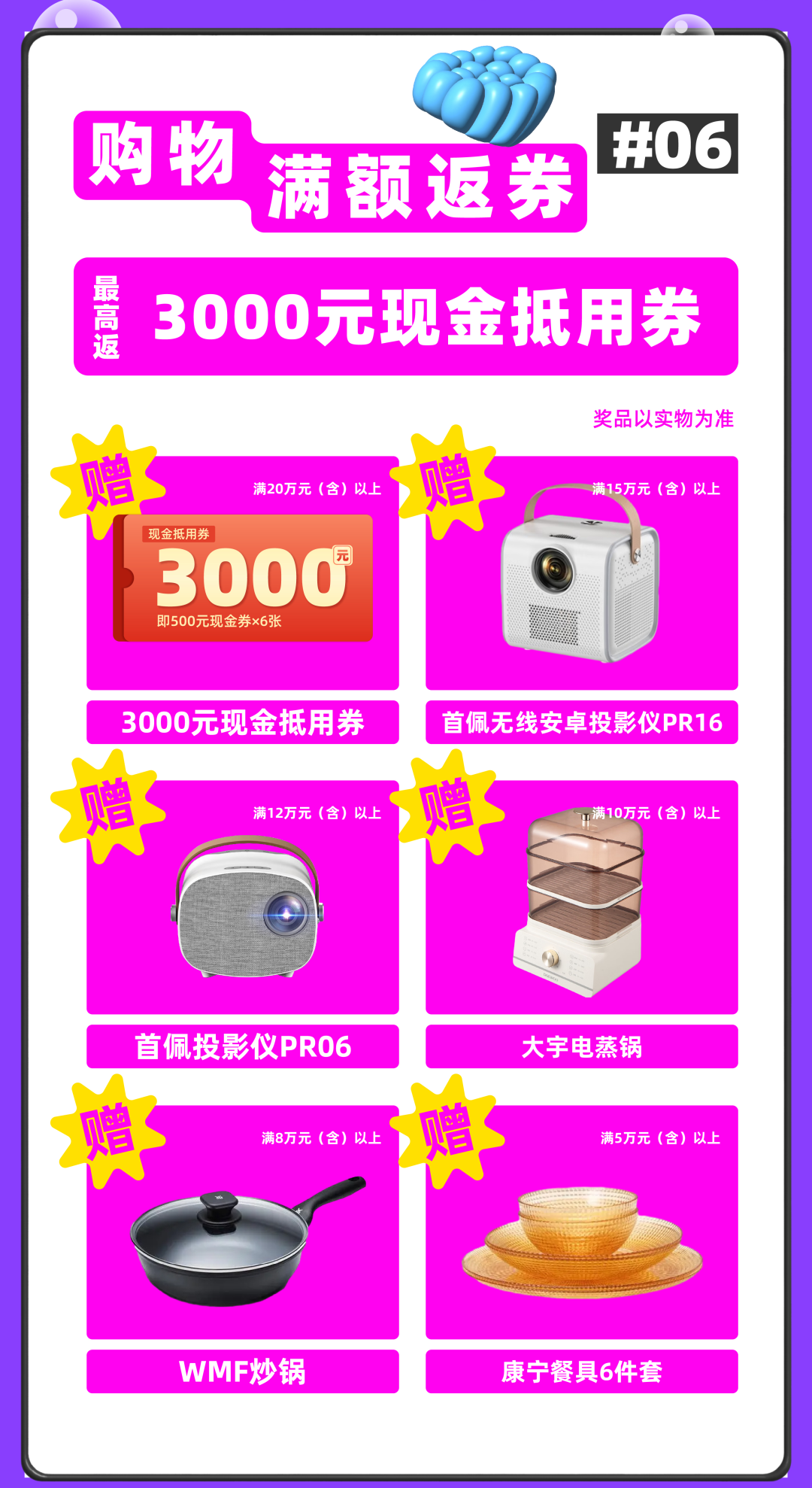 当日单笔销售合同实付金额达到规定条件,即可持销售合同到商场赠礼处兑换对应礼品;