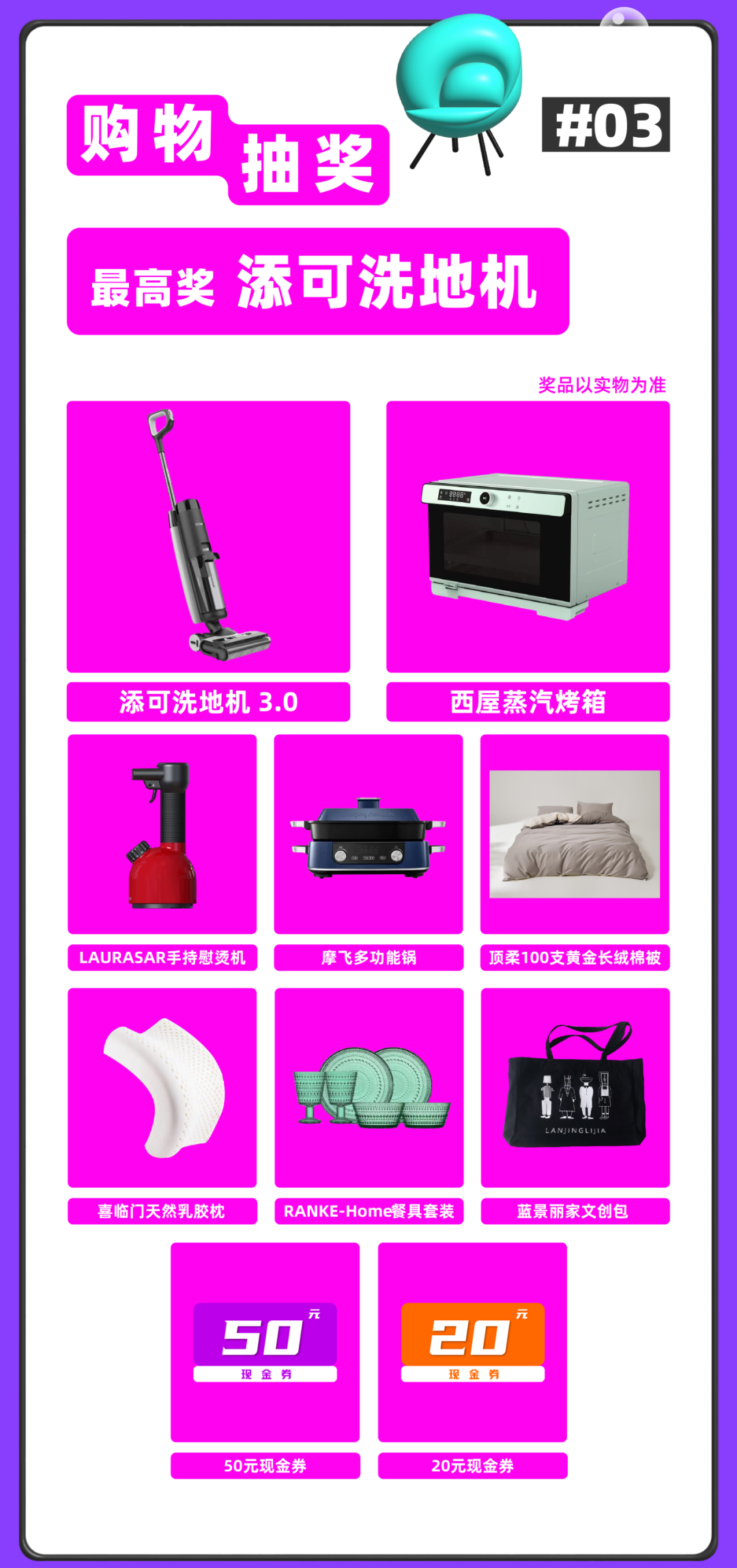 50/20元现金券,仅限在商场参加活动的品牌处购物,新签销售合同、并由商场收银台收取,单笔销售合同各券,限用10张;