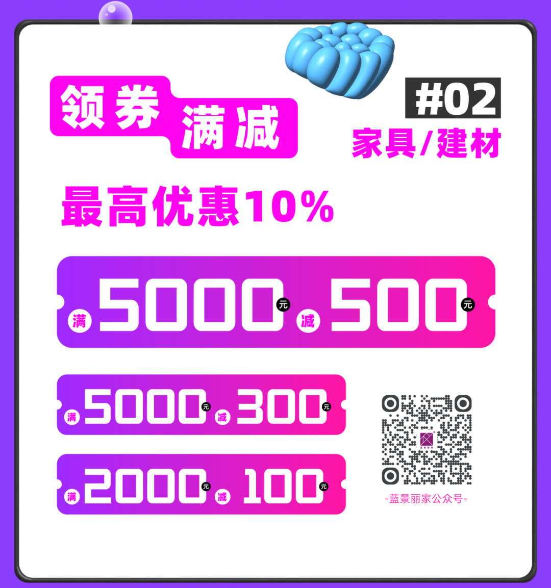 关注蓝景丽家官方公众号(微信号:lanjinglijia ),活动期内进入导航栏领券中心参与领券;