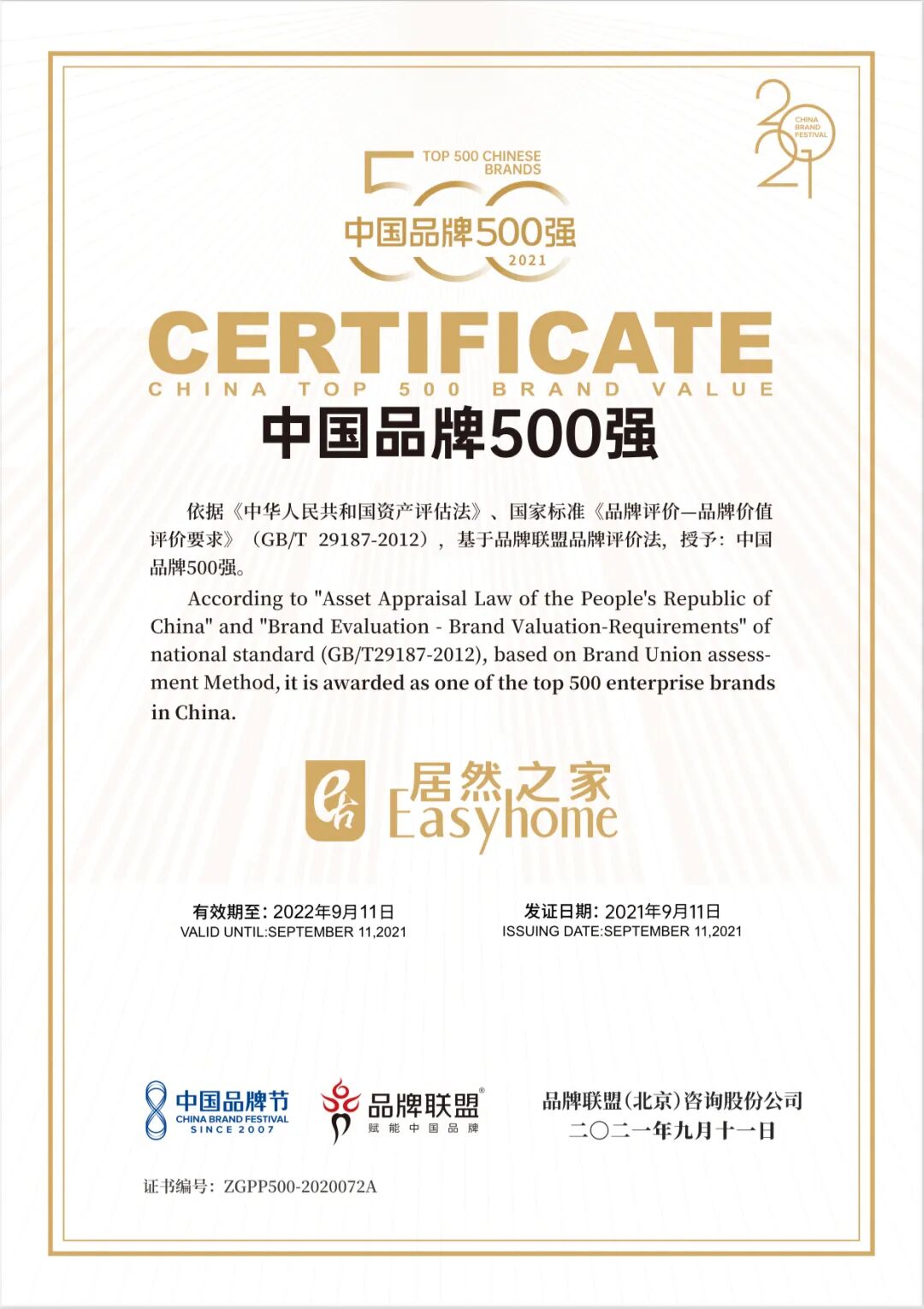 居然之家获评2021中国品牌节最高荣誉“华谱奖”,并从消费者角度、财务角度和市场角度等多维度评价下,在16000余个本土品牌(包含港澳台地区)中脱颖而出,被评为“中国品牌500强”。