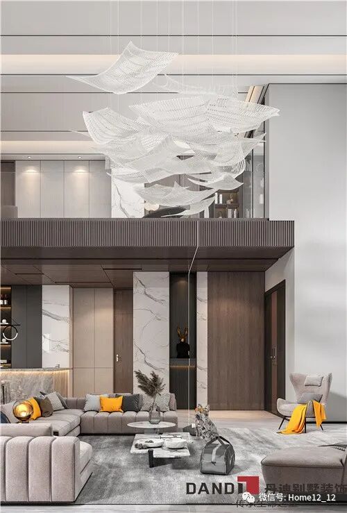 竖向空间打通,中空天花搭配异形片状组合吊灯,极具现代科技、时尚感。简约大气转角组合沙发聚拢了横向区域,使得水平空间饱满不漏气。整体布局合理舒适,充满秩序感。